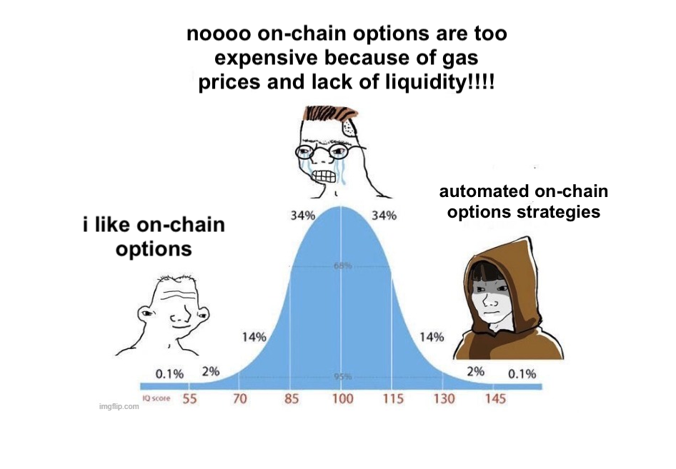 Instead of lending, one of the most lucrative ways of earning yield on assets like ETH or WBTC is through option writing strategies. Option writing (selling options) can create enhanced yields (>30% APY) while maintaining exposure to the underlying asset, making it a great way to accumulate a specific asset. However, these strategies are not trivial to execute operationally — they require selection of option strikes and expiries, rolling over options, and constantly making decisions about yields vs risk-of-exercise.